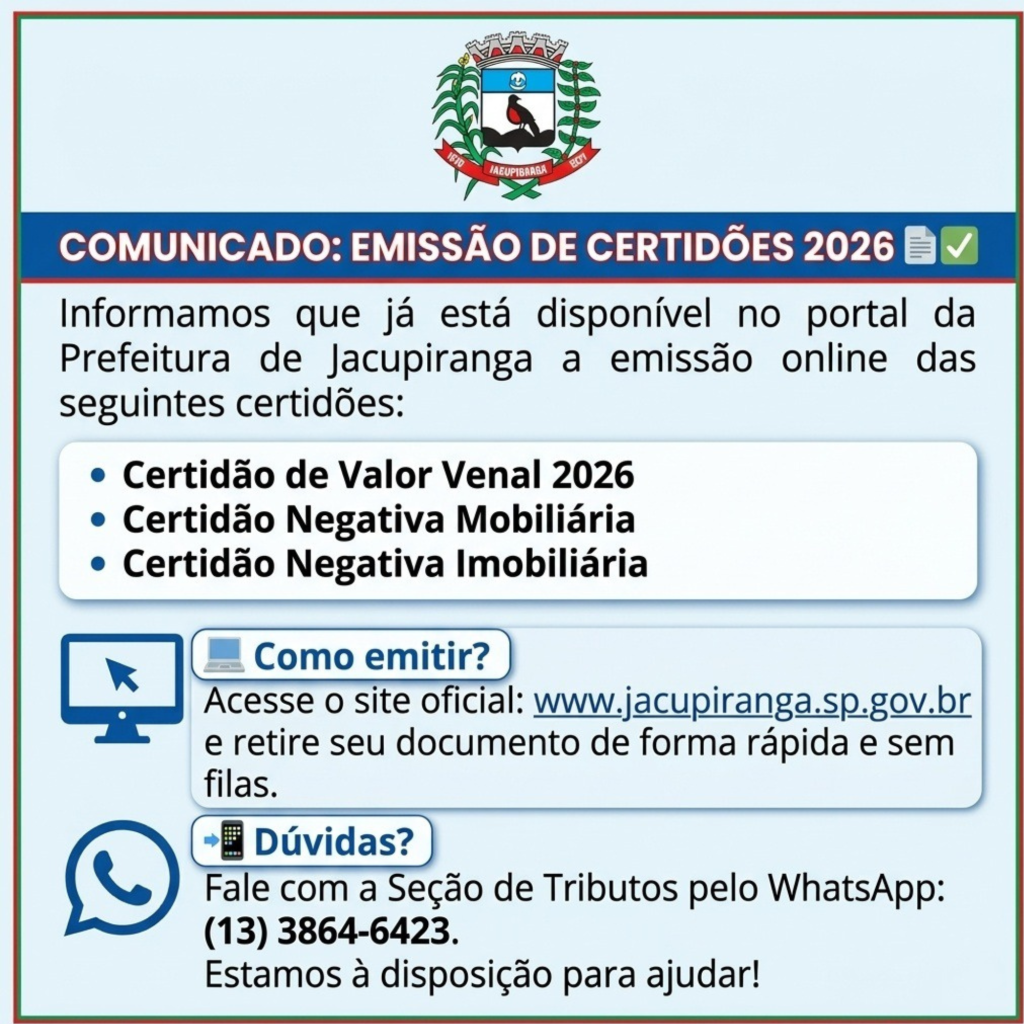 EMISSÃO ONLINE DE CERTIDÕES 2026 JÁ ESTÁ DISPONÍVEL A Prefeitura de Jacupiranga informa que já está disponível, no portal oficial do município, a emissão online de importantes certidões municipais. Agora, os cidadãos podem acessar os documentos de forma rápida, prática e sem precisar enfrentar filas. Estão disponíveis para emissão: • Certidão de Valor Venal 2026 • Certidão Negativa Mobiliária • Certidão Negativa Imobiliária Para emitir, basta acessar o site oficial da Prefeitura: ???? www.jacupiranga.sp.gov.br Em caso de dúvidas, a Seção de Tributos está disponível para atendimento pelo WhatsApp: ???? (13) 3864-6423 Prefeitura Municipal de Jacupiranga – Cuidando da cidade, bairro a bairro.