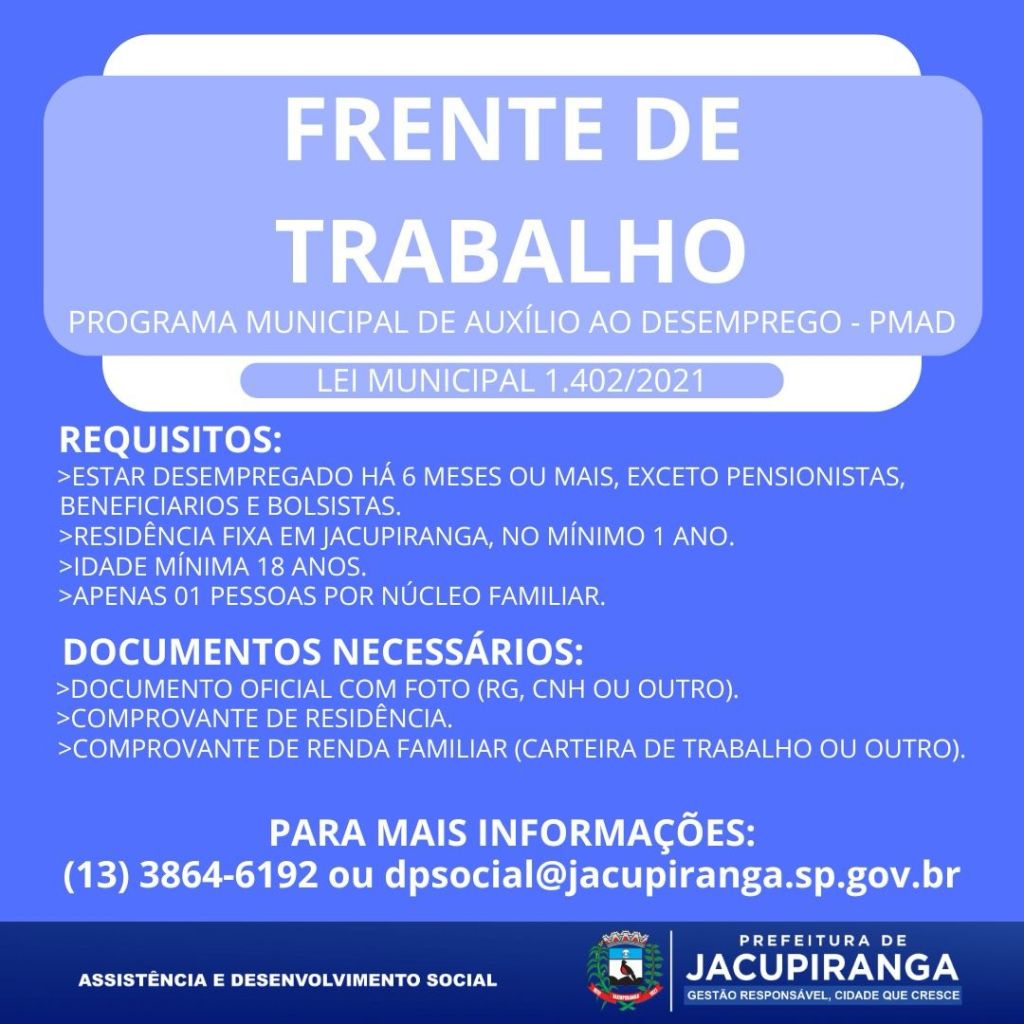 A Prefeitura de Jacupiranga, por meio da Secretaria Municipal de Assistência e Desenvolvimento Social, informa que estão abertas as novas inscrições para o Programa Municipal de Auxílio ao Desemprego (PMAD), conforme a Lei Municipal 1.402/2021.
