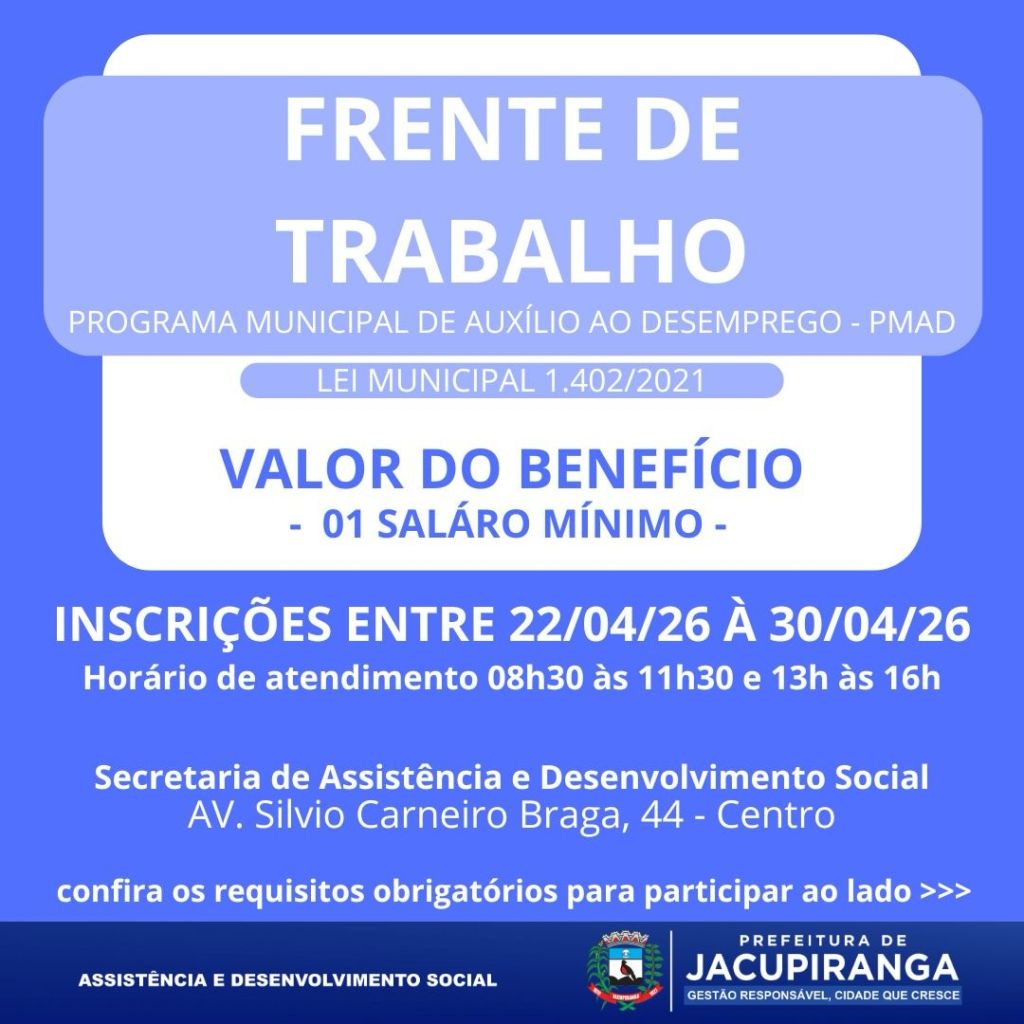 A Prefeitura de Jacupiranga, por meio da Secretaria Municipal de Assistência e Desenvolvimento Social, informa que estão abertas as novas inscrições para o Programa Municipal de Auxílio ao Desemprego (PMAD), conforme a Lei Municipal 1.402/2021.